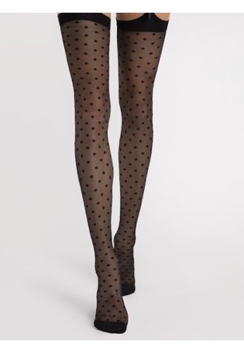 Découvrez ces élégants bas autofixants noirs qui combinent l'aspect résille avec un motif à pois et des jarretelles intégrées dans le tissu pour une illusion parfaite.