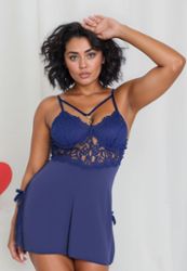 Der Babydoll-Schnitt schmeichelt Ihren Kurven mit Eleganz. Die gekreuzten Träger und das Schmuckdetail bringen einen Hauch von sophistiziertem Glamour. Erhältlich in intensivem Schwarz und Königsblau, passt dieses Babydoll zu allen Körpertypen, in Standard- und Übergröße.