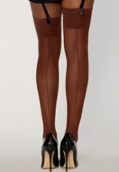 Αυτό το καλσόν φοριέται με ζαρτιέρα. Το χρώμα σοκολατί προσφέρει μια ζεστή εναλλακτική στους κλασικούς τόνους. Το nylon προσαρμόζεται φυσικά στα πόδια σας.
