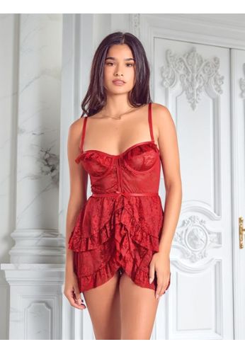 Ένα babydoll με συντονισμένο σλιπ. Κορσάζ με ενισχύσεις και μαλακά κύπελλα. Δέσιμο στο ντεκολτέ και μικρά βολάν στις τιράντες. Σατέν ταινία και γραμμή Empire για να αρμονίσει τη σιλουέτα. Μπροστινό άνοιγμα διακοσμημένο με βολάν.