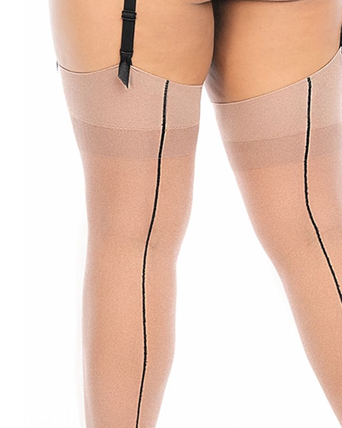 Ανακαλύψτε τις δικτυωτές κάλτσες μας στο χρώμα του δέρματος, με έναν πονηρό σατέν φιόγκο στην καλτσοδέτα και μια λαμπερή ραφή στο πίσω μέρος.