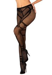 Tight black tights with a wide crotch opening, offering different textures and transparencies.