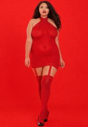 Un bodystocking opaco y cómodo en talla grande, con impresionantes medias liguero de encaje integradas. El efecto visual de liguero y medias con la comodidad de un bodystocking.