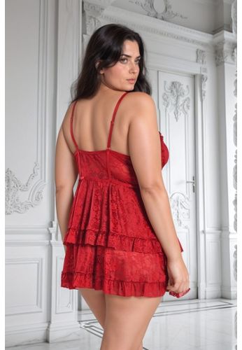 Serenity es ese conjunto babydoll lujoso en encaje rojo que realza magníficamente todas las morfologías. Encaje integral con armaduras, volante encaje en la abertura de los copas, detalle agujero de cerradura al centro. Falda dos niveles asimétrica con volante encaje en el dobladillo. Tirantes ajustables y string encaje asortido. Edición Lujo que se adapta a todas las tallas.