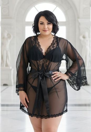 Voluptuosa : un negligé transparente voluptuoso y terriblemente sexy con string coordinado. Mangas anchas con aberturas glamurosas, cinturón de satén, muy agradable de llevar. Perfecto solo o sobre tus outfits favoritos, disponible en talla grande y talla estándar.