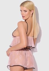 Il est composé d'un caraco en dentelle, à bonnets souples, orné d'une lisière satinée contrastée. Et d'un superbe short assorti à taille élastique.