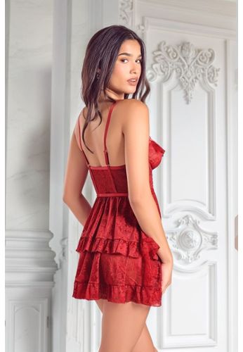 Ένα babydoll με συντονισμένο σλιπ. Κορσάζ με ενισχύσεις και μαλακά κύπελλα. Δέσιμο στο ντεκολτέ και μικρά βολάν στις τιράντες. Σατέν ταινία και γραμμή Empire για να αρμονίσει τη σιλουέτα. Μπροστινό άνοιγμα διακοσμημένο με βολάν.