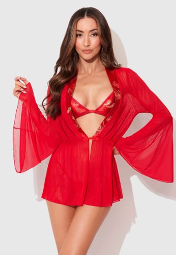 L'ensemble Dragon Kimono trois pièces vous transforme en impératrice avec son kimono maille transparente aux manches fluides, son soutien-gorge triangle et son string satin jacquard à motif dragon.