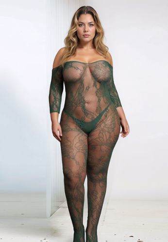 This bodystocking plays the elegance card with its floral lace motifs on a fine fishnet background.