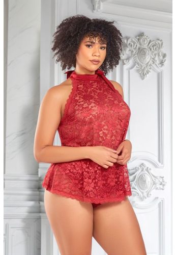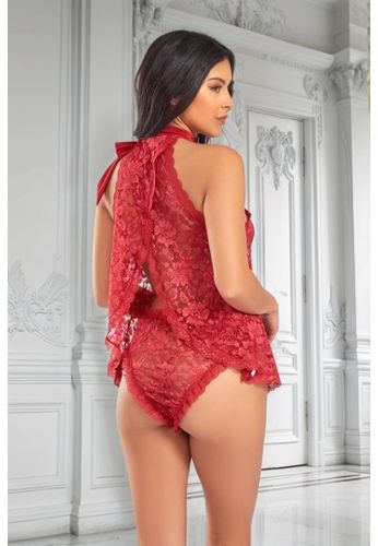 Hera é aquele babydoll costas nuas em renda muito macia vermelha, 2 peças muito sexy. Renda brilhante integral com fita de pescoço na lateral e costas volantes. Calcinha atrevida inteiramente em renda com aberturas pernas volantes muito provocadoras. Gusset em algodão para o conforto. Perfeito para se sentir linda e sensual.