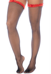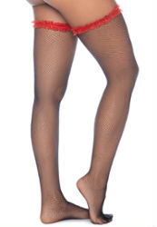 Sublimez votre silhouette avec ces bas autofixants en résille noire, rehaussés de délicates finitions jarretières rouges à volants et nœuds en satin.