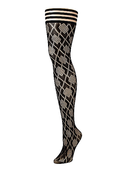 Um contraste marcante: Rubia hold-ups, uma combinação de nude e preto para pernas irresistíveis, disponível em todos os tamanhos.