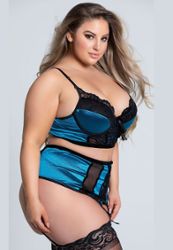 O Conjunto Tatiana Turquesa e Preto combina o luxo da lingerie fina de designer no seu tamanho. Três peças coordenadas: sutiã com aros, cinta-liga alta e tanga. Cetim, tule fino e renda magnífica. Elegância e conforto garantidos.